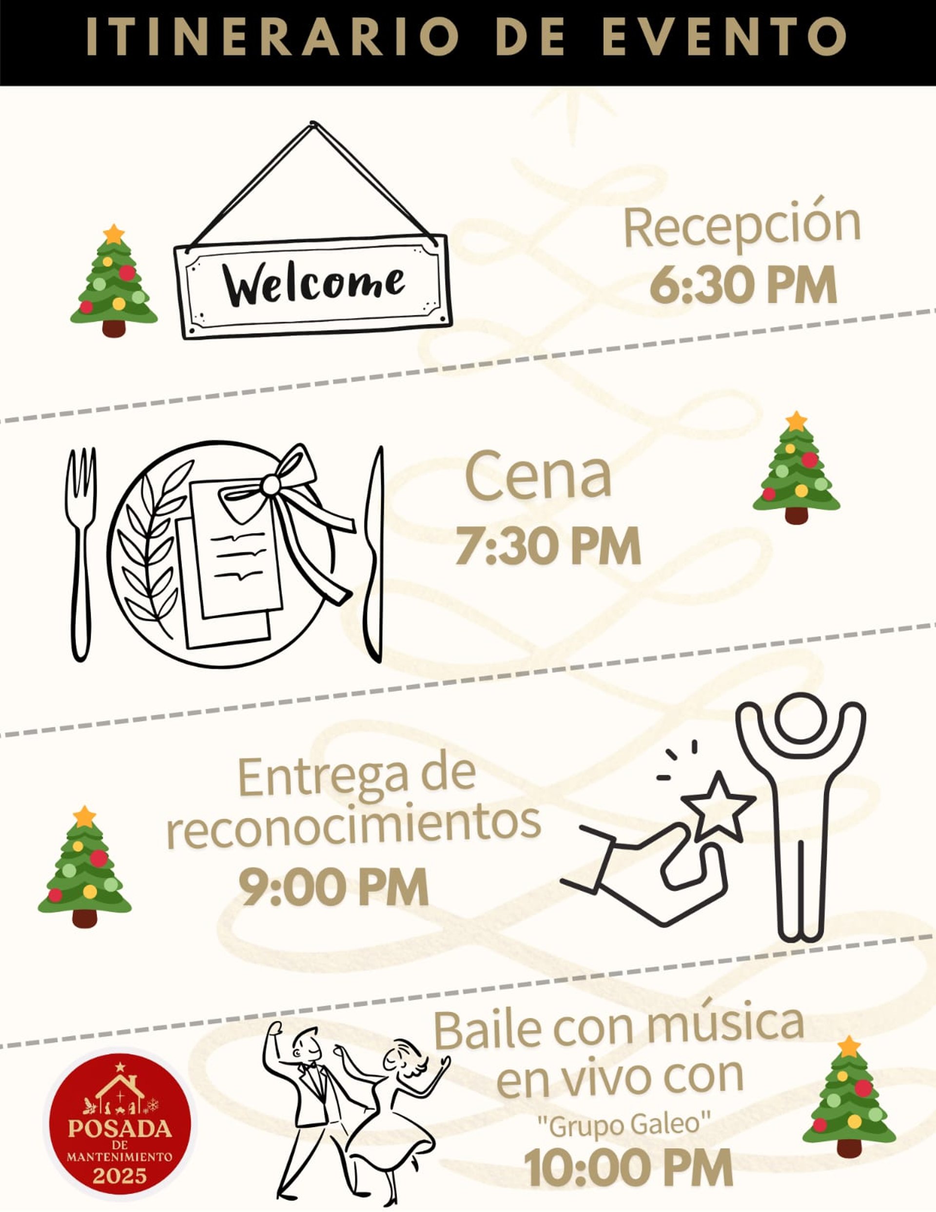 Acompáñanos a la gran posada de gala cena baile, estás invitado a formar parte de está celebración anual tan esperada. Será una noche llena de alegría, música y buena compañía, donde podrás disfrutar de una exquisita cena y participar en divertidos bailes.¡Te esperamos con los brazos abiertos y muchas sorpresas!